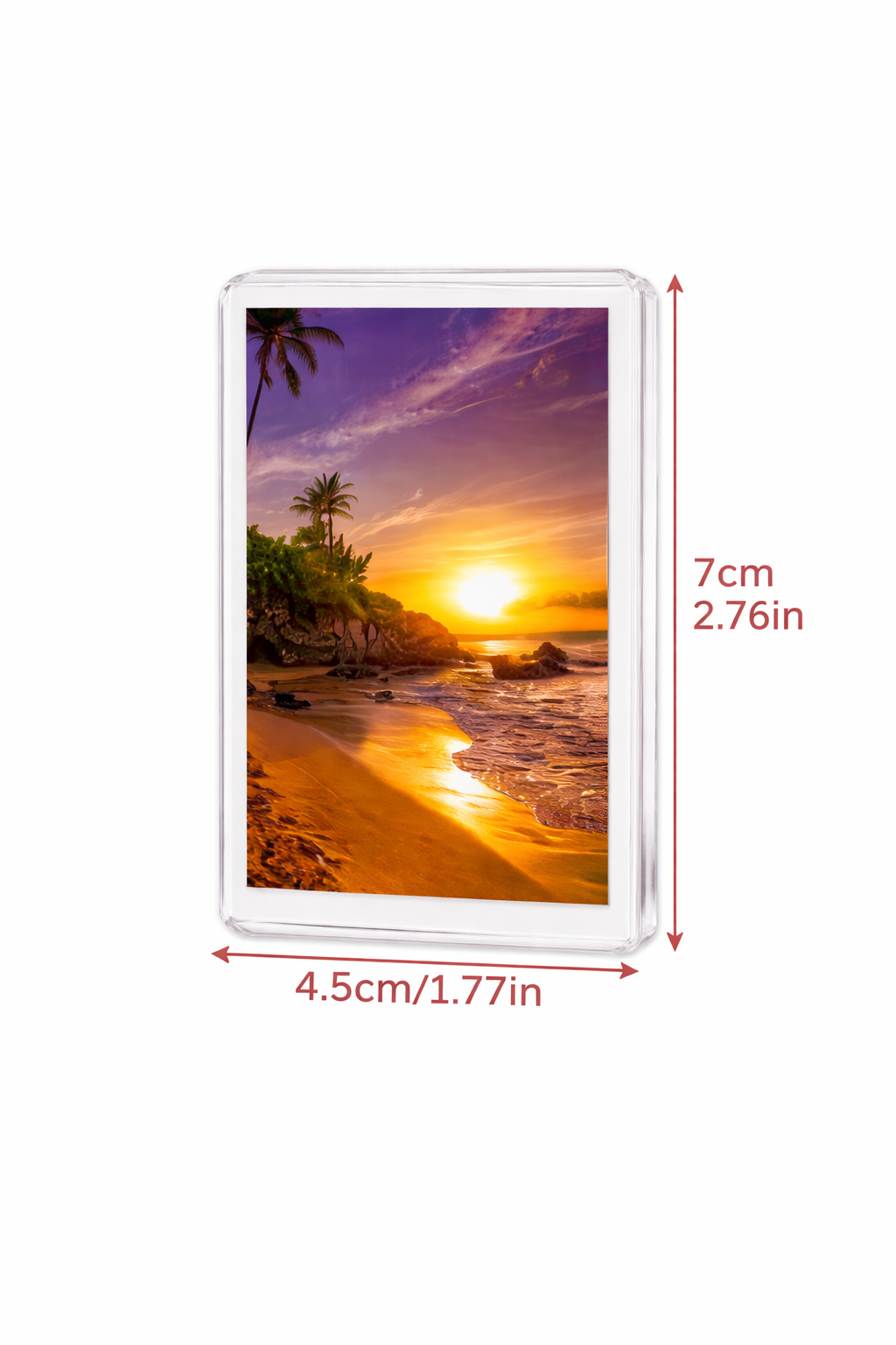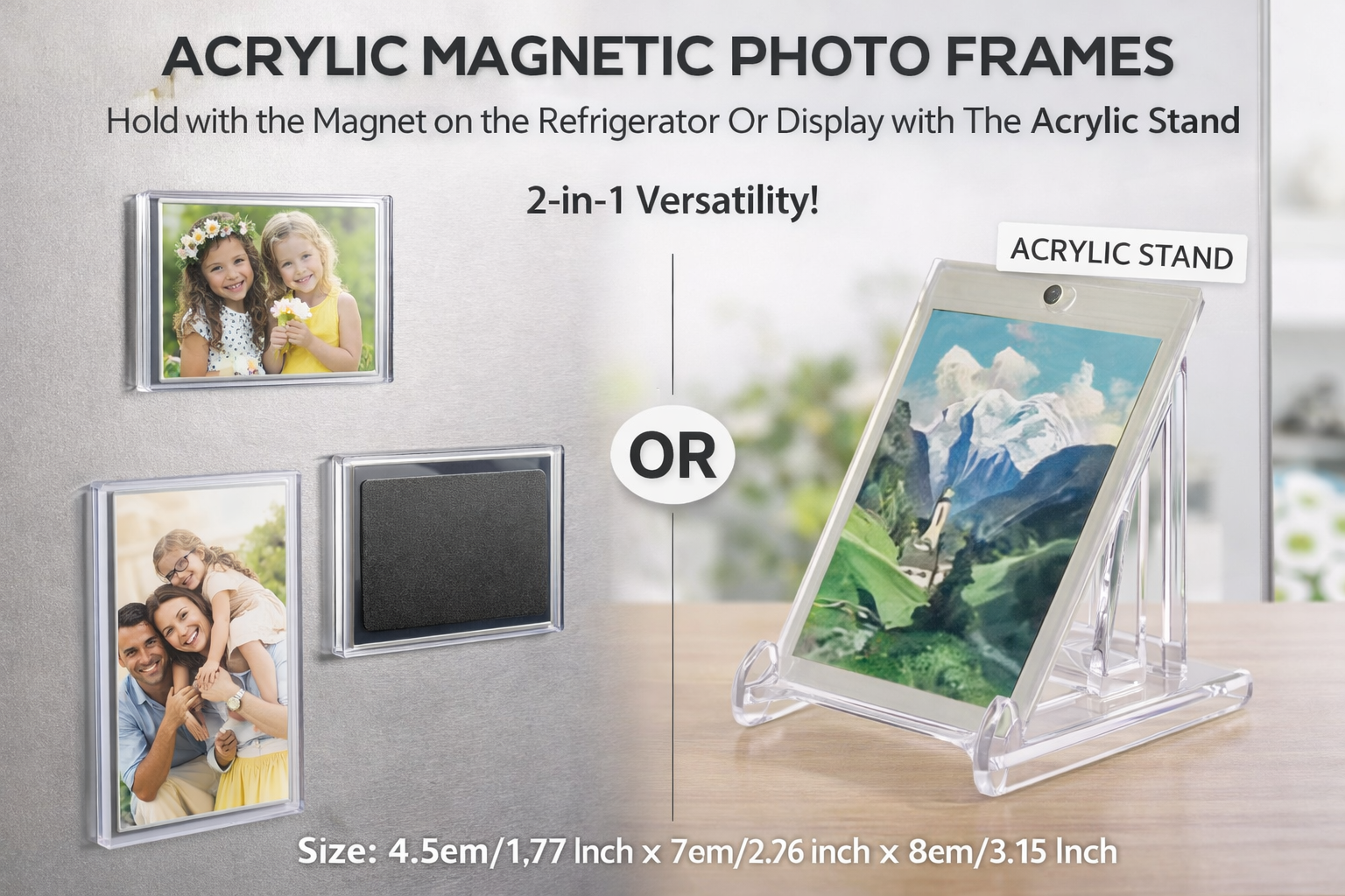 Premium Acrylic Magnetic Photo Frame – Perfect for 4.5cm x 7cm photos. Crystal-clear finish with strong magnet backing. Compact, elegant, and ideal for refrigerators or any metal surface.